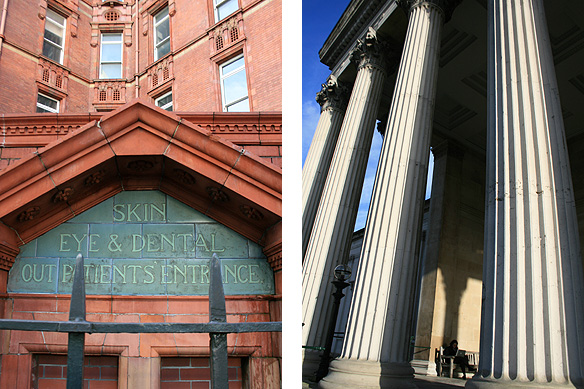 University College London (UCL); Top left: Detail, Cruciform Building, UCL’s Medical School