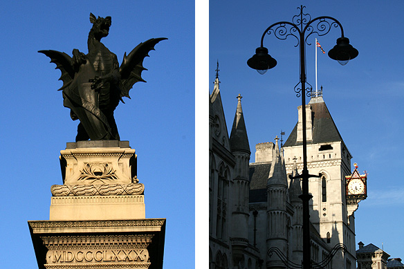 Iconic landmarks on The Strand: Royal Courts of Justice and Temple Bar Memorial