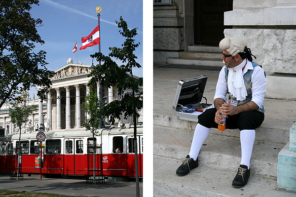 Politics and the arts on the Ringstrasse: The classical Austrian Parliament; A short break for a theater artist on the steps of the National Theater
