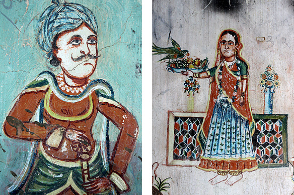 The wall paintings are neither sophisticated in style nor technique. Painted on wet plastered surfaces with brushes made from the bark of palm trees and colours extracted from pebbles, leaves and clay held together with gypsum, their charm lies in their vibrancy and spontaneity. I find the consistently grouchy expressions, of mortals and deities alike, with downturned lips smeared on the caricatured faces the most amusing. Almost endearing. 🙂 Why so cynical, dear Kutchi?