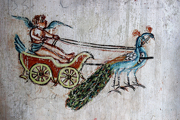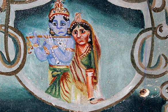The little portico in the Than Monastery is a veritable treasure trove of Kamangari wall art. There are cherubic angels riding chariots driven by peacocks. Scenes from the Mahabharata with benevolent sages and divine deities flank secular everyday compositions of lovers in earnest flight being chased by arrows from a slighted admirer. The self-important official, dancing maidens, and platters of exotic fruit and flowers, together create a heady chronicle of the people of Kutch 300 years ago, not necessarily of life in Kutch, but rather of life as experienced or imagined by the Kutchi.