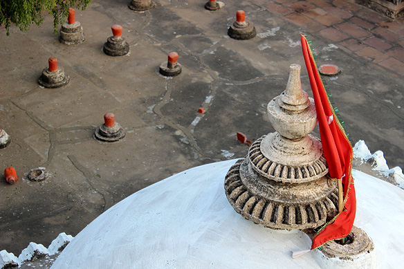 Shrines and vermillion smeared stones dedicated to yogis having taken samadhi dot the monastery grounds. While the monastery exteriors are plain, clad in limestone with vermillion marks, its interiors in contrast are a riot of colour. Walking through corridors, arches and rooms, I enter the inner sanctum of the main temple around which I circumambulate in pitch darkness. My exploration ends on the roof overlooking a sea of domes topping the shrines, listening to the birds sing to each other in a beautiful, almost eerie, surreal world. 🙂