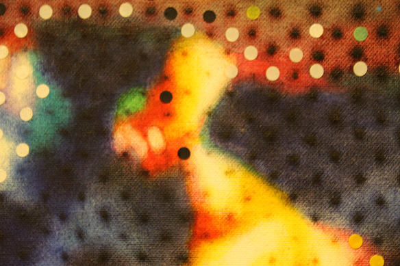The showing starts with a series of huge canvases alluding to large format newspapers. The compositions are based on toys which Joshi abstracts with ‘Ben-Day Dots’ to create visions of colour much like Roy Lichtenstein, well-known American pop artist from the 1960s used in his comic strip paintings.