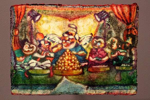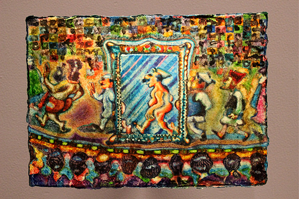 As I step closer, yet another world unfurls—a satire rooted in broadsheet cartoons morphed into the artist’s personal commentary on recent social and political events and personalities in India. I recognize Arvind Kejriwal, Manmohan Singh and Narendra Modi. I see athletes and war zones, Jesus Christ and Hindu priests.