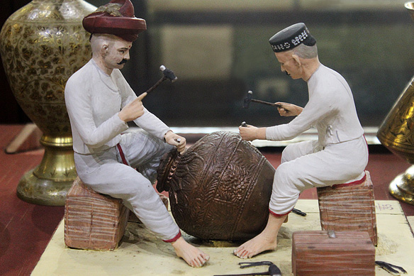 The clay model shows how lacquer on brass was made in India in the late 19th – early 20th Century. In the beginning the decorative art had bold brass designs in relief. However, the European preference for detail and intricacy led to the incorporation of minute designs known as marori work in it.