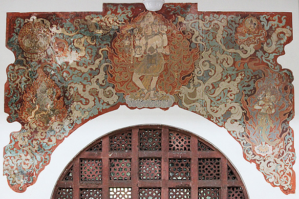 On the fourth wall is the Battle of Kurukshetra fought between the cousins, Kauravas and Pandavas. The central frame [top] shows Krishna persuading Arjun to fight on the lines of the Bhagwad Gita. To its left, Abhimanyu, ordered by his uncle Dharma to break the chakravyuha set by Dronacharya is shown surrounded by the Kaurava army, fighting valiantly without any weapons [this blog post’s title picture]. In the right frame [above], Dhritarashtra and Queen Gandhari lament the death of their sons, their bodies burning, turning into ashes.