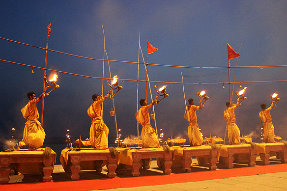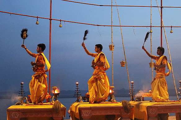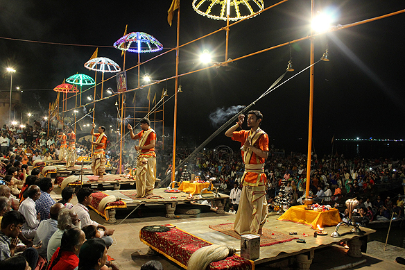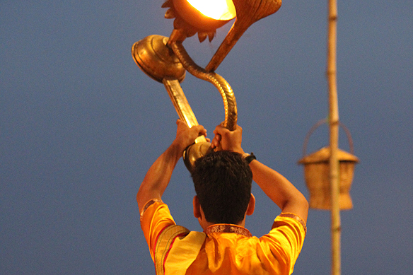 Evening aarti at Dashashwamedh Ghat, Varanasi’s main ghat. One cannot go to Varanasi and not attend this grand spectacle, where the superlatively large crowds of tourists on land and water vie with the aarti for attention.