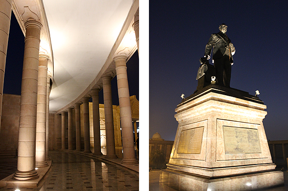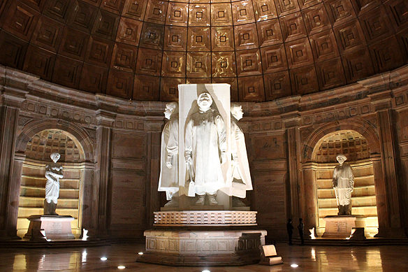 Centre-piece of the colonnaded semi-circular Bhimrao Ambedkar Samajik Parivartan Gallery—a towering bronze statue of Dr Bhimrao Ambedkar.
