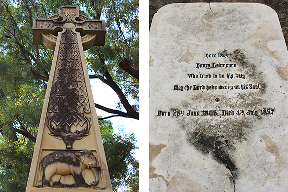 Below Right: Henry Lawrence’s grave in St. Mary Church and Cemetery inside the Residency, where 2,000 of the defenders were mass buried, many with just a quick prayer: “Here lies Henry Lawrence who tried to do his Duty. May the Lord have mercy on his Soul. Born 28th June 1806. Died 4th July 1857.”