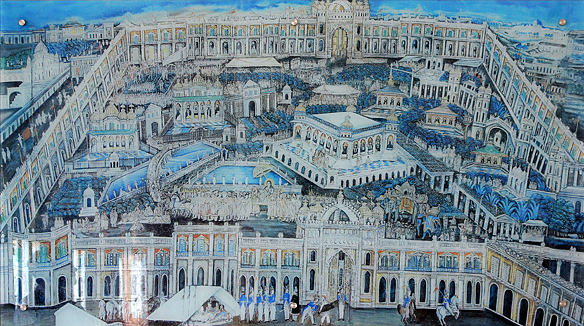 A 19th Century engraved drawing of Qaiser Bagh with Nawab Wajid Ali Shah accompanied by his entourage.