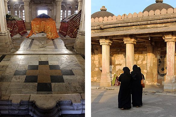 The Sarkhej Roza ensemble is dedicated to Ahmed Shah I’s advisor, the Sufi saint Ganj Baksh. Left: Tombs of Sultan Mahmud Begada and other royal family members lie inside.