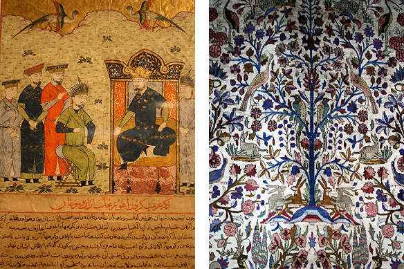 Qajar art is a unique combination of Persian and European forms. The gardens and columns are Moorish. The tiles and glasswork Persian. And now and then a mystifying juxtaposition occurs with a semi-nude woman on a painted tile surrounded by Islamic blue tiles covered with geometric patterns.