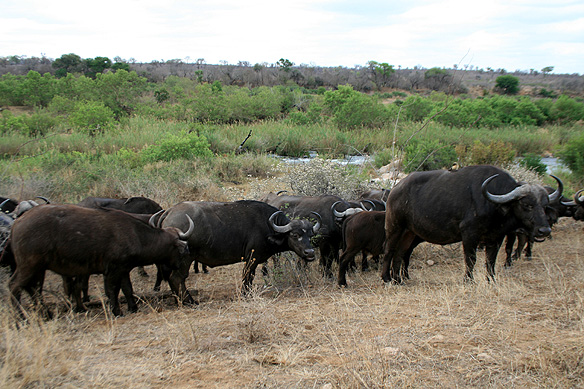 I stayed for three days and two nights and, yes, saw all the Big 5. 🙂 Which boiled down to herds of buffaloes and elephants, a leopard smacking away its lips after an impala kill, rhinos marking their territories with trails of urine and dung, and seven lions and a herd of buffaloes battling away on the banks of a stream after the lions had attacked one of the buffaloes.