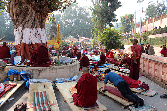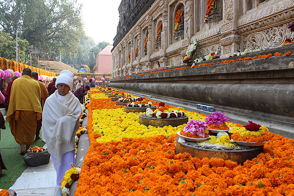 The entire Mahabodhi Temple Complex in Bodh Gaya, in the Indian State of Bihar, is draped with marigolds, lotuses, and roses. Hundreds of ochre and red-robed shaven-headed Buddhist monks and nuns prostrate in prayer in the grounds, and around the main temple. A handful of tourists quietly join the circumambulations around the main temple. I see pilgrims from Bhutan, Burma, Cambodia, China, Japan, Korea, Thailand, Tibet, and Sri Lanka in deep prayer. Most are dressed in their traditional attires. I see a few pilgrims from the West as well, no less in the purity of their faith. Groups chant with micro precision around me, not one voice out of sync, their mantras punctuated with the crescendo beats of rattle drums.