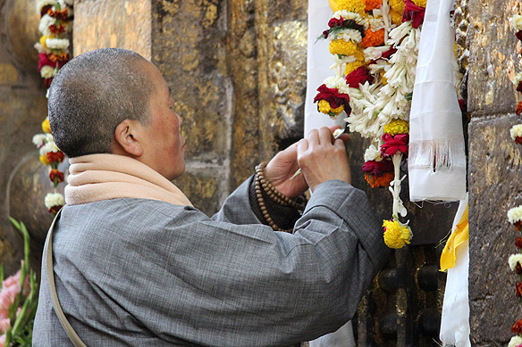 A pilgrim ties an offering around the railing which surrounds the Bodhi tree.