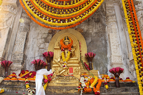 Don’t miss the prayer bell donated by the Burmese and kneeling figures at the bases of the entrance torana. Whilst at it, also watch out for the standing Buddhas carved in black stone flanking the main temple doorway and the white pigeons which have made the niches lining the shikara [temple tower] their home.