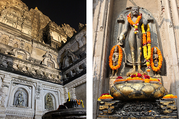 Mahabodhi Temple in all its glory; Right: Standing Buddha by the main door.