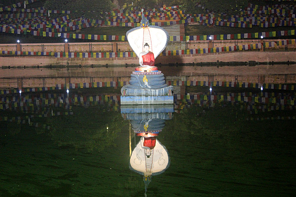 Lotus Pond, just outside the temple complex enclosure where Buddha spent his sixth week after enlightenment, meditating. The snake is Muchhalinda, the serpent king who protected Buddha from a terrible storm during this week.