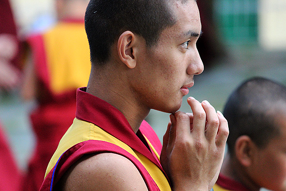 A monk ponders on his next line of argument at the evening debates held in the Dalai Lama Temple Complex.