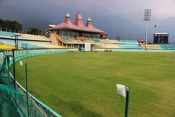 The picturesque, even on a rainy cloudy day, Dharamshala Cricket Stadium.