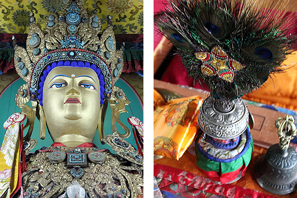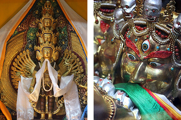 Left: The thousand-armed Avalokiteshwara with eyes on each palm so he may see and bless all his devotees; Right: Detail of tantric Kalachakra and Vishvamata effigy. [Kalachakra Temple]