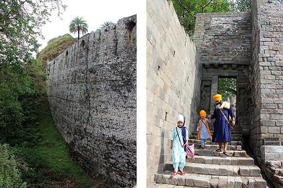 Left: Part of the 300-metre-high wall encircling the fort; Right: A Sikh family explores their Sikh ancestry at Kangra Fort.