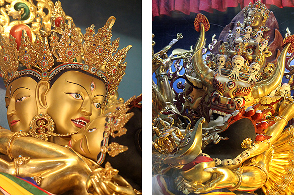 Tibetan Tantric Buddhism has its own unique pantheon of deities. Left: Guhyasamaja, tantric deity of the highest yoga tantra order; Right: Bhairava, the ferocious form of Manjusri. [Gyuto Monastery]