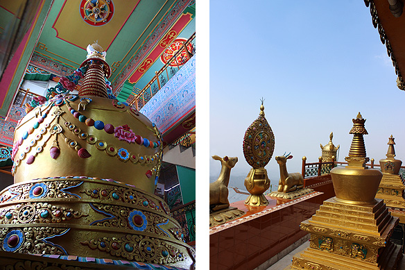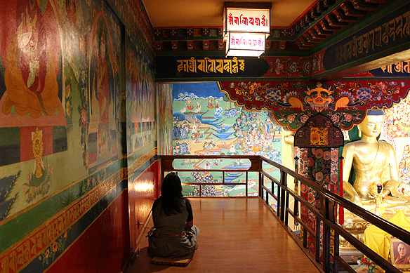 Dip Tse Chok Ling Monastery’s main temple is filled with Tibetan religious paraphernalia, including the above thangka. The monastery traces its origin to an 18th Century gompa in Lhasa destroyed during China’s cultural revolution.