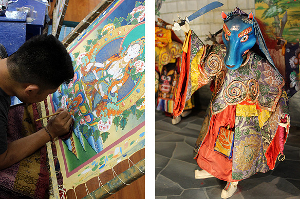 Left: An artist works on a thangka painting guided by ancient traditions; Right: The Institute’s Losel Doll Museum houses over 150 dolls in traditional Tibetan costumes created by a group of artist-monks from Drepung Loseling Monastery.