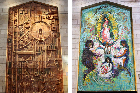 In dazzling contrast to the architectural heaviness are these gorgeous, airy mosaics of Mary and Jesus which line its walls. They offer fascinating insights into different cultures and how each interprets this central Christian theme in their own unique way! Clockwise, starting top left, is the mosaic from America, Japan, Mexico, and Canada.