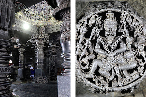 Left: Hoysala temple architecture’s signature lathe-carved pillars in the navranga mandapa; Right: This is a detail and epicentre of the wondrous ceiling over the dais. It depicts Narasimha, Vishnu’s half-man half-lion avatar tearing out the intestines of Hiranya Kasipa.