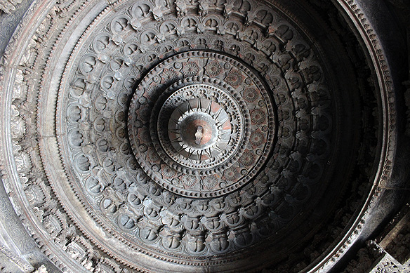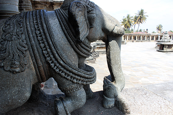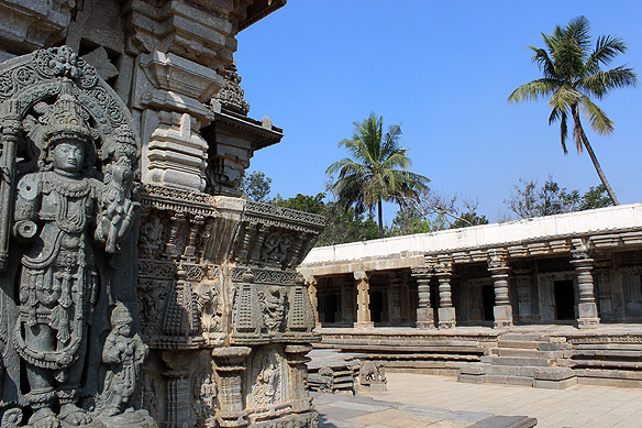 Inside the dim interior, sixteen ceiling panels are carved with various stages of a blooming plantain flower, a key part of offerings made to Vishnu to this day. Unlike the temples at Belur and Halebidu, the temple has its vimanas over the sanctums—still intact. It is also the least damaged of the three temples by the Islamic forces from Delhi.