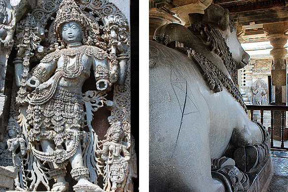 Left: Detail, dwarapal guarding the entrance. Every effigy in a Hoysala temple, along with its props, is an exquisitely carved monolith; Right: Colossal nandis face both the garbagrihas. Nandi, the sacred bull, is believed to be Shiva’s ‘vehicle.’