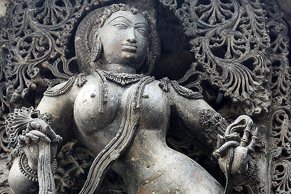 If stones were to narrate lucid poetry about the sensuous beauty of a woman, their point of reference would be the Chennakesava [Beautiful Keshava] Temple in Belur. Thirty-eight voluptuous maidens, known as madanikas, in various Bharatanatyam dance and ritual poses hold up the ceiling outside in effortless grace, some signed by the sculptors themselves. Four madanikas support the ceiling inside, above the circular dais where 900 years ago Queen Shantala Devi once danced for the gods.