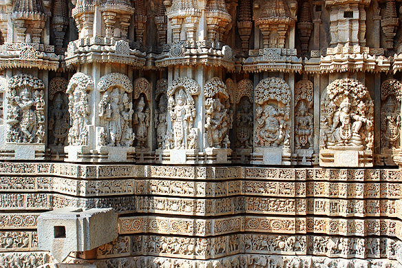 Deconstructing the friezes bottom to top: Marching elephants, lions, scrolls, horsemen, scrolls, legends from sacred Hindu texts, makaras, swans and peacocks, scrolls, large panels of deities.