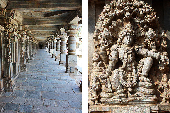 Left: That point in eternity. A pillared corridor lined with shrines encircles the Keshava Temple courtyard; Right: Vishnu seated on a coiled snake.