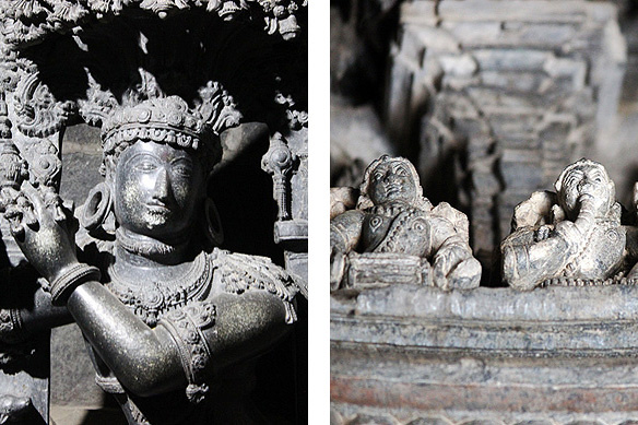 Left: Isn’t he beautiful? Krishna with his flute deep inside one of the recesses created by the star-pronged structural wall; Right: Krishna again, this time with women musicians. Though a Shaivite temple, the temple walls contain images of the entire Hindu pantheon.
