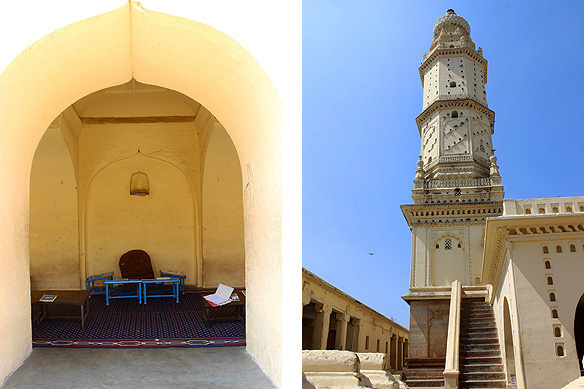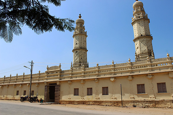 This charming Jumma [Friday] Mosque, decorated with geometric lines composed of niches, was built by Tipu Sultan in 1787. Above left: A classroom in the madrasah inside.
