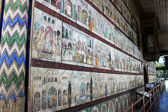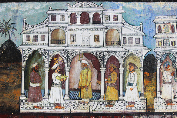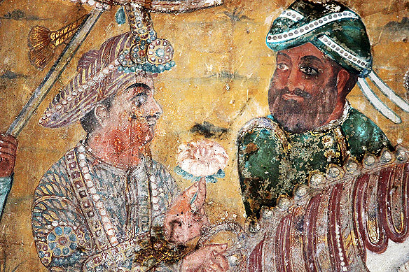 Top: Dariya Daulat Bagh’s entire eastern wall is a heady array of Tip Sultan’s contemporaries. Above: Courtier receiving guests in his home, eastern wall. Just look at their costumes and expressions!