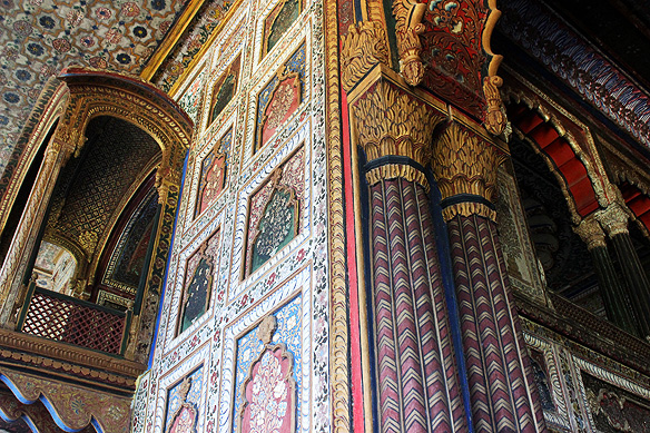 Splendid painted stucco and Tipu Sultan’s signature striped pillars decorate the large airy halls in Dariya Daulat Bagh.