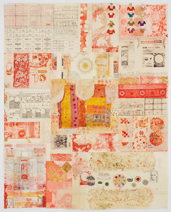 Calcutta Chronicles: Etching, aquatint, woodblock print, collograph, drawing, watercolour, collage, gold leaf, glass “gems” on Japanese Kozo and Arches paper; 38 inches X 51.25 inches [2013]
