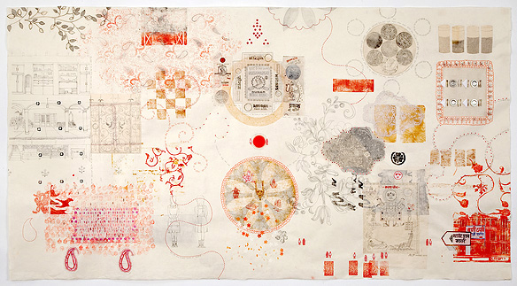 The Road She Travelled: Drawing, Japanese woodblock printing, thread and objects on Japanese Okawara paper; 38 inches X 70 inches [2010]