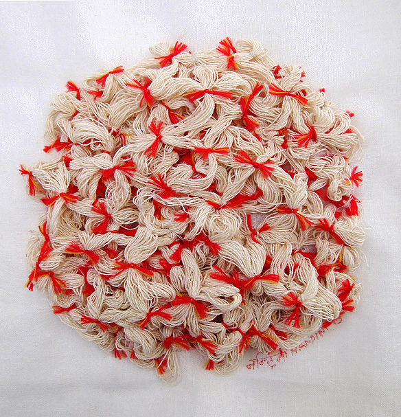 How Many Ways am I Tied to You?: Moli and Janeu thread on muslin fabric; 5 inches diameter X 0.5 inches [2015]