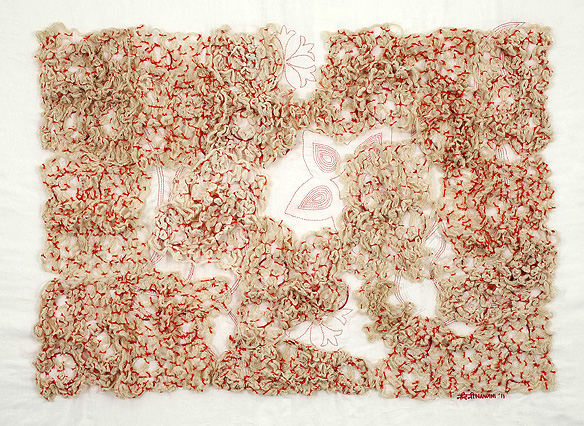 How Many Ways am I Tied to You?: Moli and Janeu threads, bangles, fabric and embroidery on muslin fabric; 32 inches X 44 inches X 1 inch [2011]
