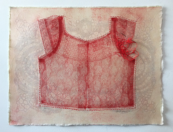 Days of Her Life: Etching, collograph, thread, archival needle on Japanese Kozo paper, mounted on Somerset paper; 14 inches X 18 inches [2016]