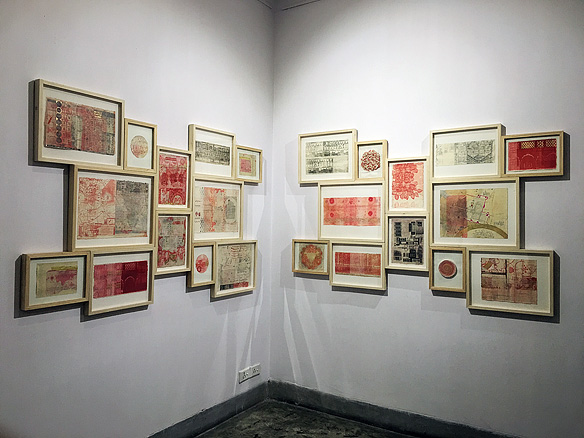 When not drawing, her work makes use of etching, aquatint, collograph, woodblock printing, chine colle, watercolour, thread, collage, and gold leaf on Japanese Kozo paper to tell her stories. The palette is just as distinctive. A lot of white and reds and pinks. The pinks, a subconscious memory of the place she grew up in, she admits—the pink city of Jaipur.