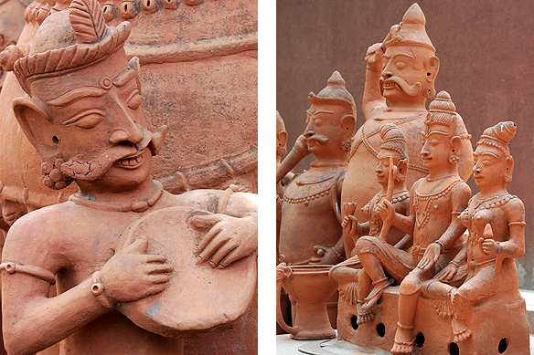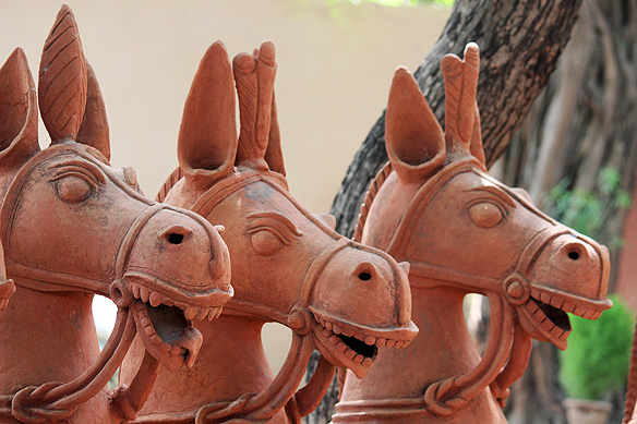 Aiyanaar Shrine [Tamil Nadu, Terracotta]. The first exhibit one encounters is the fantastical Aiyanaar shrine with its herd of terracotta horses. Seated amidst them is Aiyanaar, a guardian folk deity in Tamil Nadu, with his two wives and attendants. His temples are found on village outskirts. Come night-time, he sets off to protect the village armed with his bow and arrow, galloping through the lanes on the terracotta horses gifted to him by his grateful devotees. [Outdoor area; audio tour stop no. 2]