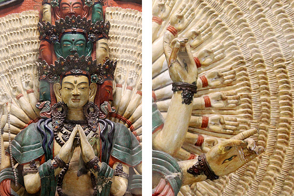 Tibetan Statue [Ladakh, Painted Wood]. All the way from Leh, in Ladakh, is this magnificent sculpture of Avalokiteshwara, the 1,000-eyed, 11-headed compassionate bodhisattva. Bodhisattvas are enlightened beings in Buddhism who chose to forego nirvana so as to help earthly beings. Look carefully and you’ll notice each of his thousand hands is painted with an eye, symbolizing his ever-seeing, ever-giving nature. [Cultic Craft Gallery; audio tour stop no. 14]