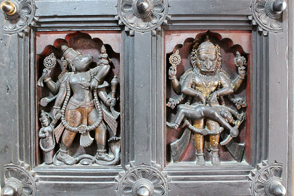 Entrance Door [Early-19th Century, Odisha, Wood and Metal]. The entrance to the galleries is guarded by a carved door which once upon a time must have stood at a temple entrance. Its panels are intricately carved with the ten incarnations of Vishnu: Fish, Tortoise, Varaha, Narasimha, Vamana, Parashuram, Rama, Balram, Krishna, and the yet to appear Kalki. The image above contains the Varaha [left] and Narasimha [right] panels. [Outdoor area; audio tour stop no. 4]