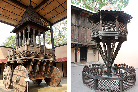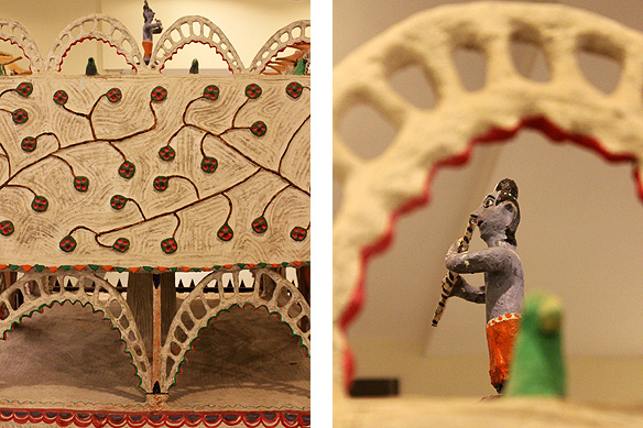 Left: Chariot [18th Century, Maharashtra, Wood and Metal]; Right: Pigeon House [Late-19th Century, Gujarat, Wood]. As one wanders through the galleries, across courtyards, one comes across two marvellous works in carved wood. The first is a chariot, which was used for Ram Ratha temple processions. It is designed to look like a temple, with deities carved on its spire. The second is a pigeon house from Ahmedabad. In Gujarat, all important squares tend to include a place for feeding birds where people can offer grains to our winged friends.